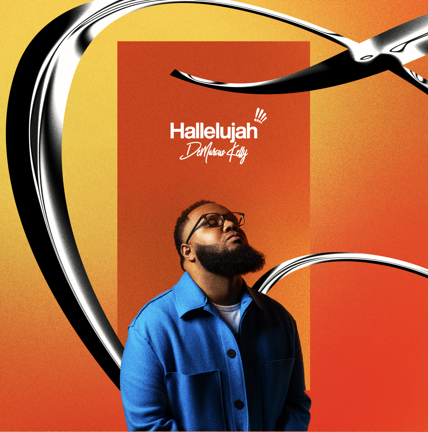 A man with glasses and a beard is looking upward, standing in front of an orange and yellow gradient background with the words "Hallelujah" and "DeMarcus Kelly" written above his head, and large metallic abstract shapes in the foreground. View fullsize