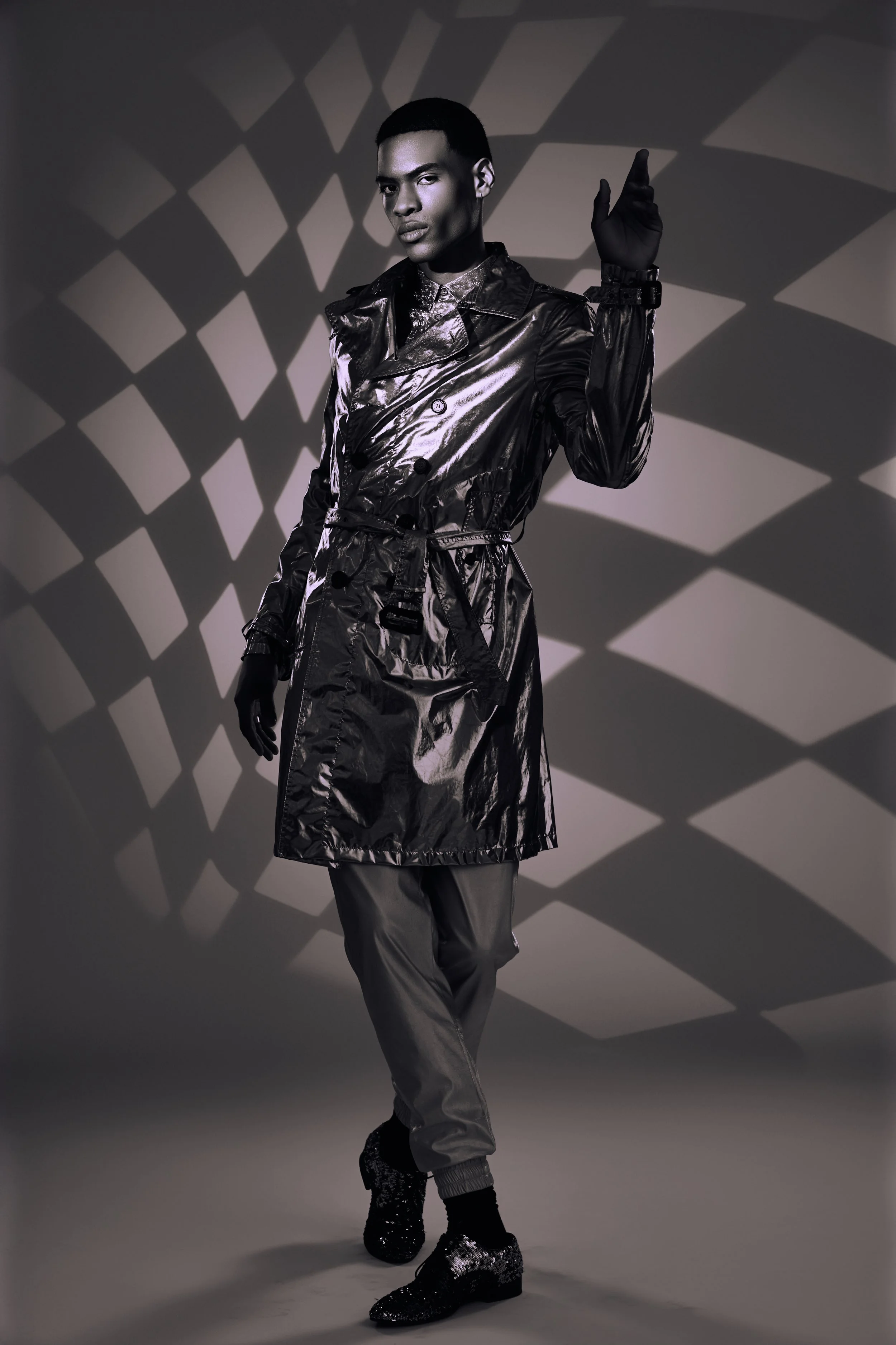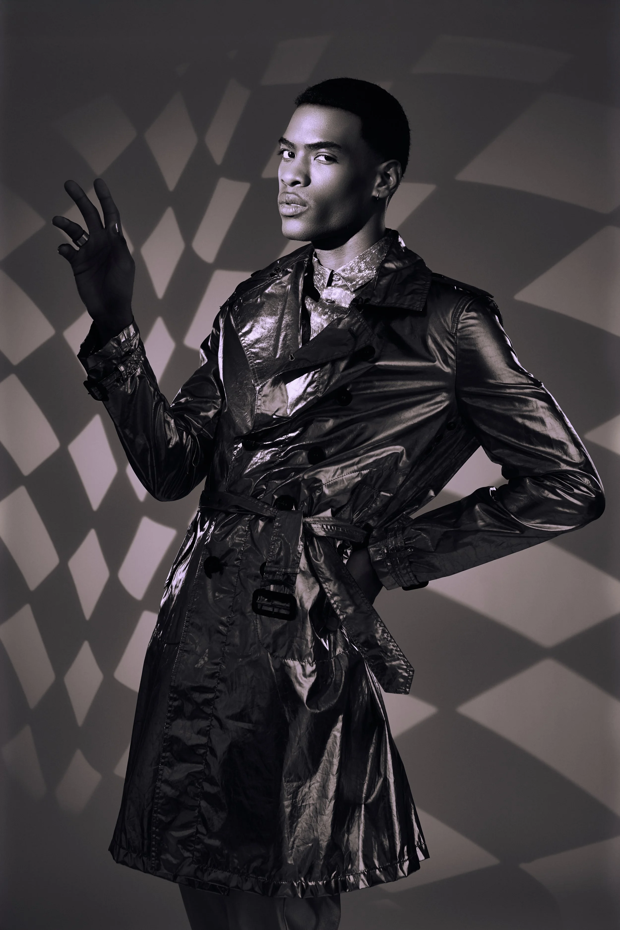 A young man with wavy hair posing outdoors on a wooden fence, wearing a long black patterned trench coat, jeans, and black shoes with red and green accents, surrounded by green trees and foliage. View fullsize