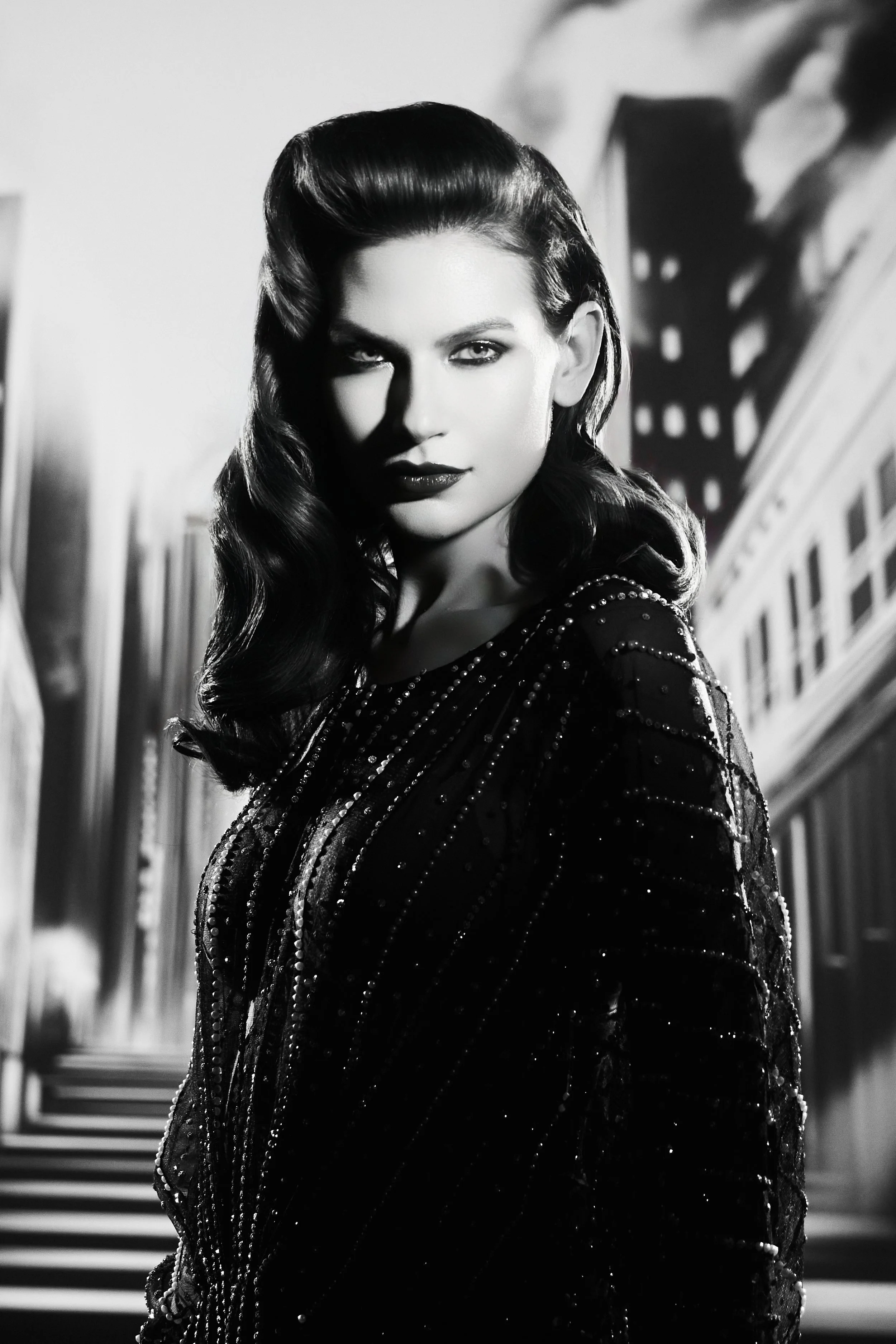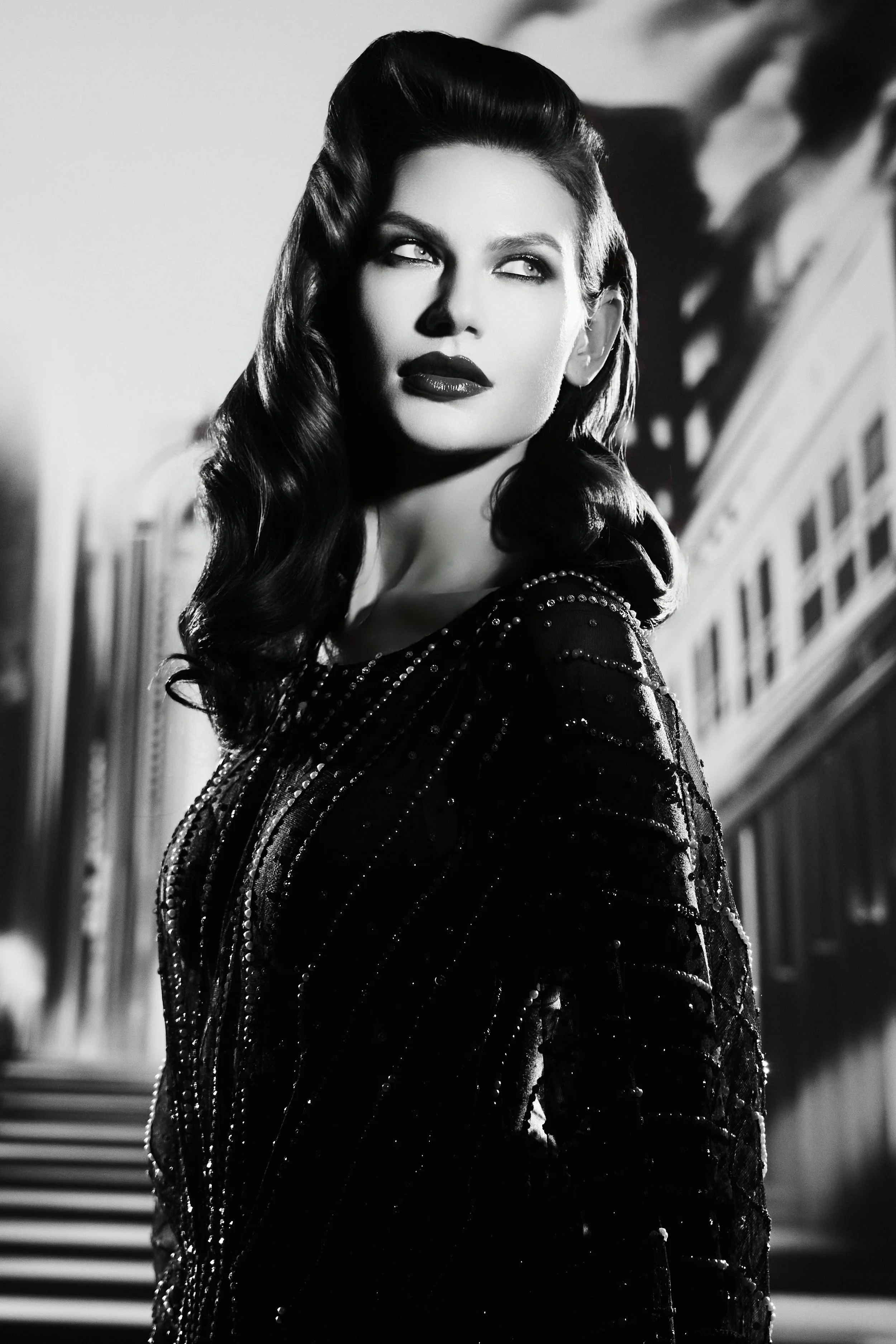 A woman with light skin, dark hair, red lipstick, and earrings, gazing at the camera, posed against a black background.