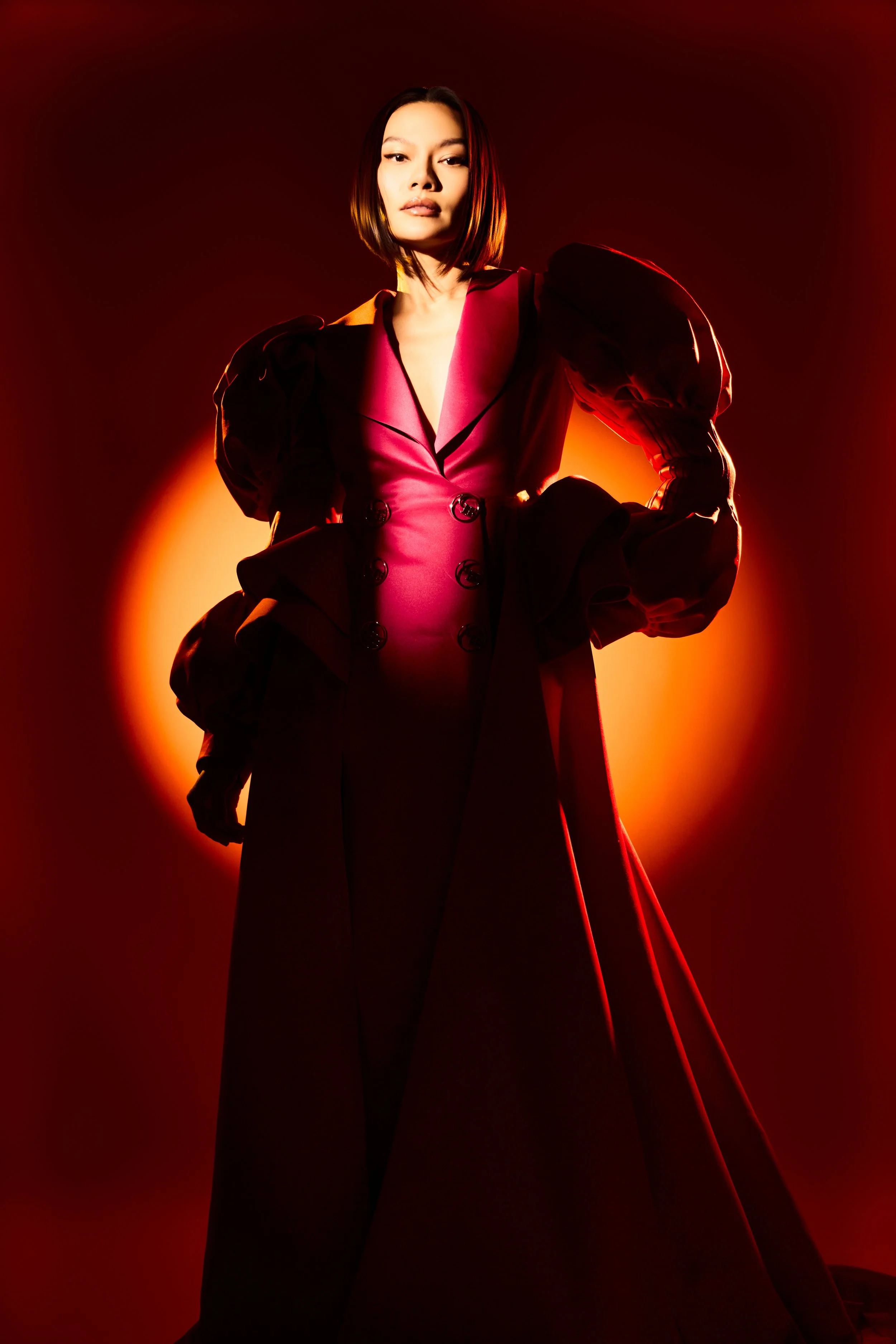 A woman with short black hair wearing a vibrant pink blazer and dark puffed sleeves stands with a confident expression. The background features warm red and orange lighting, creating a dynamic swirl around her. View fullsize