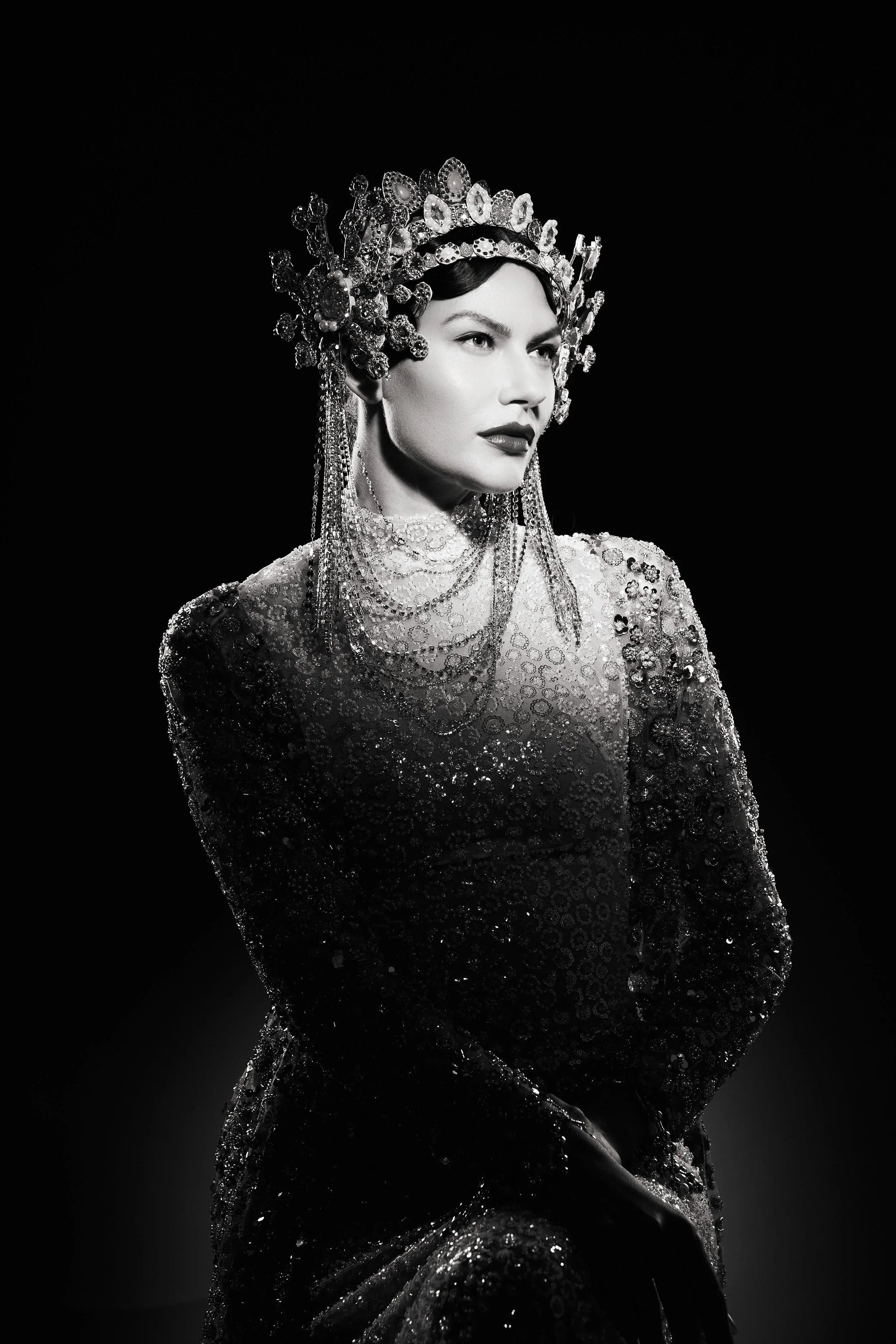 Black and white portrait of a woman wearing a sequined dress and an elaborate headpiece made of large, sparkling decorative elements, captured in profile. View fullsize