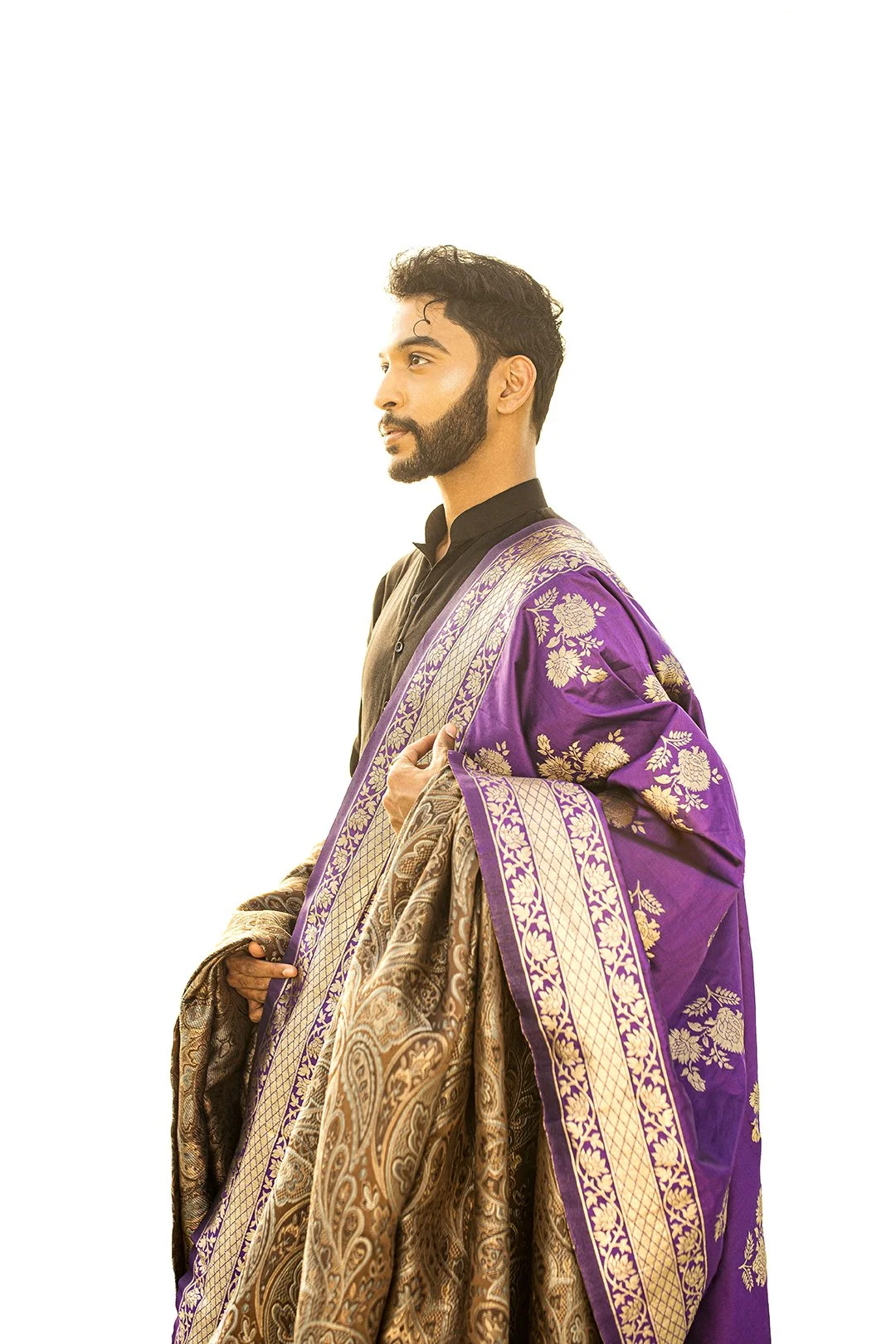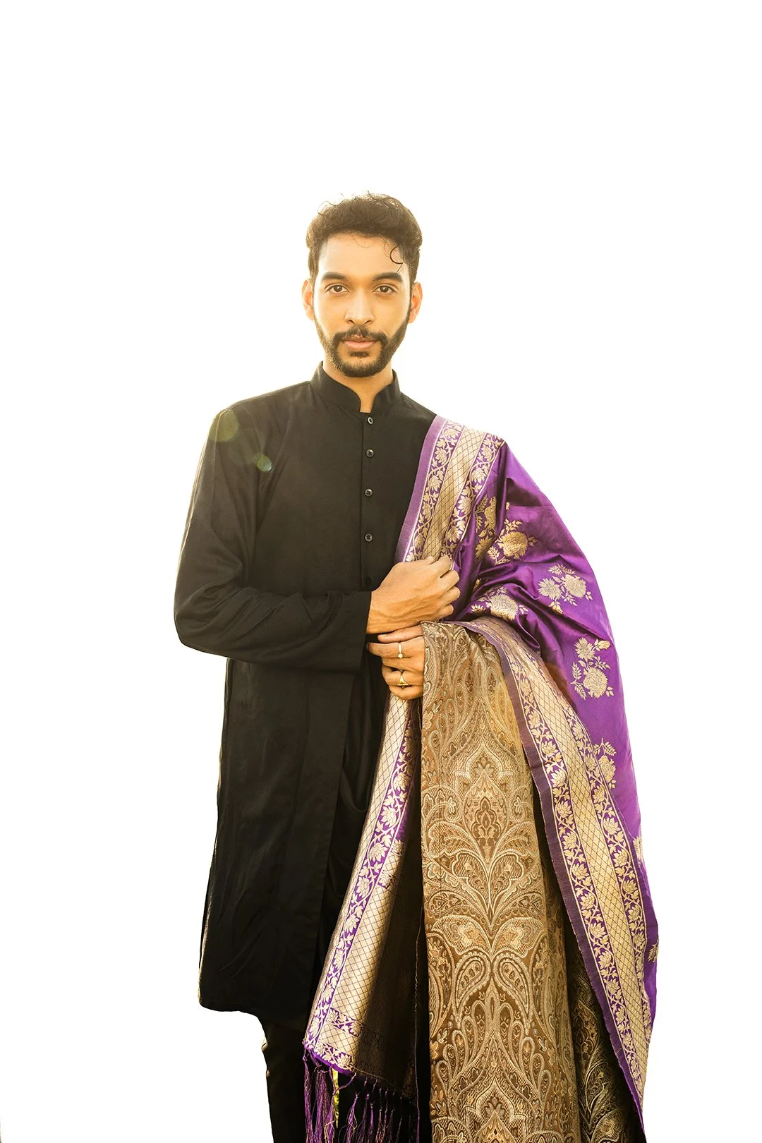 A man dressed in traditional Indian attire, wearing a black kurta with a purple and gold embroidered saree or dupatta over his shoulder, standing against a bright background.